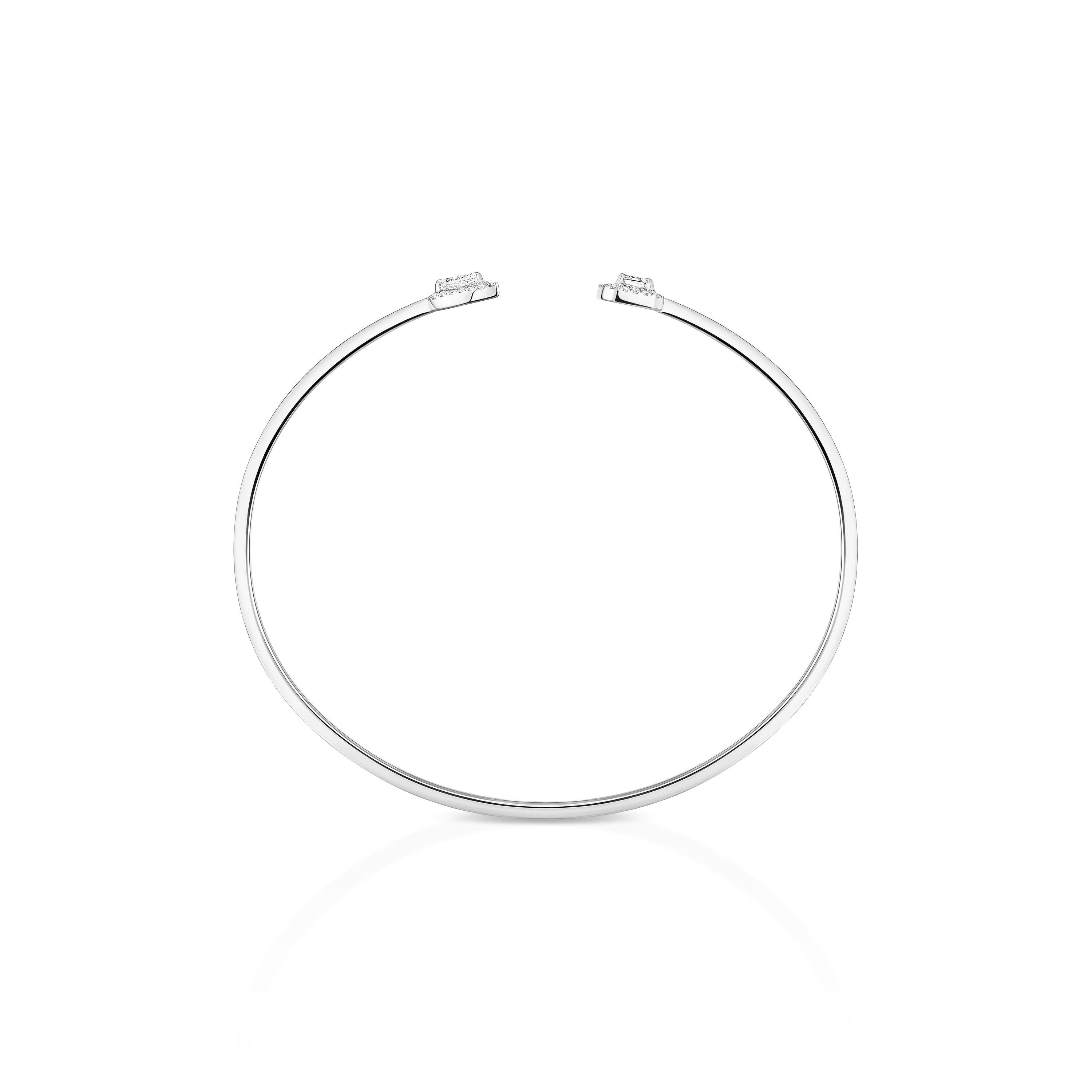 Ce jonc d'or en or blanc 18 carats est serti d'un diamant taille poire et d'un diamant taille emeraude de 0,15 carat chacun.
