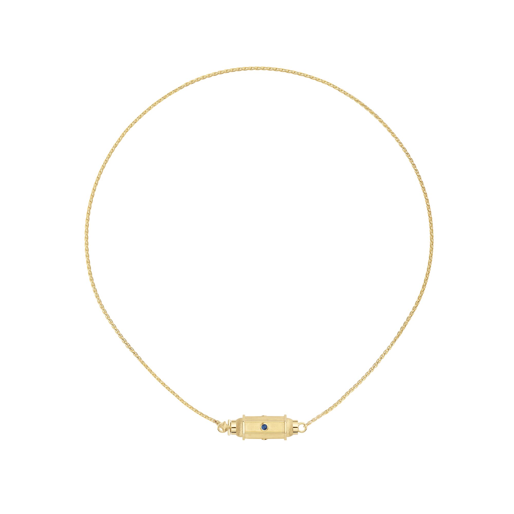 Micro locket effet coco et serti de saphir, monté sur une chaîne Spiga en or jaune de 42cm.