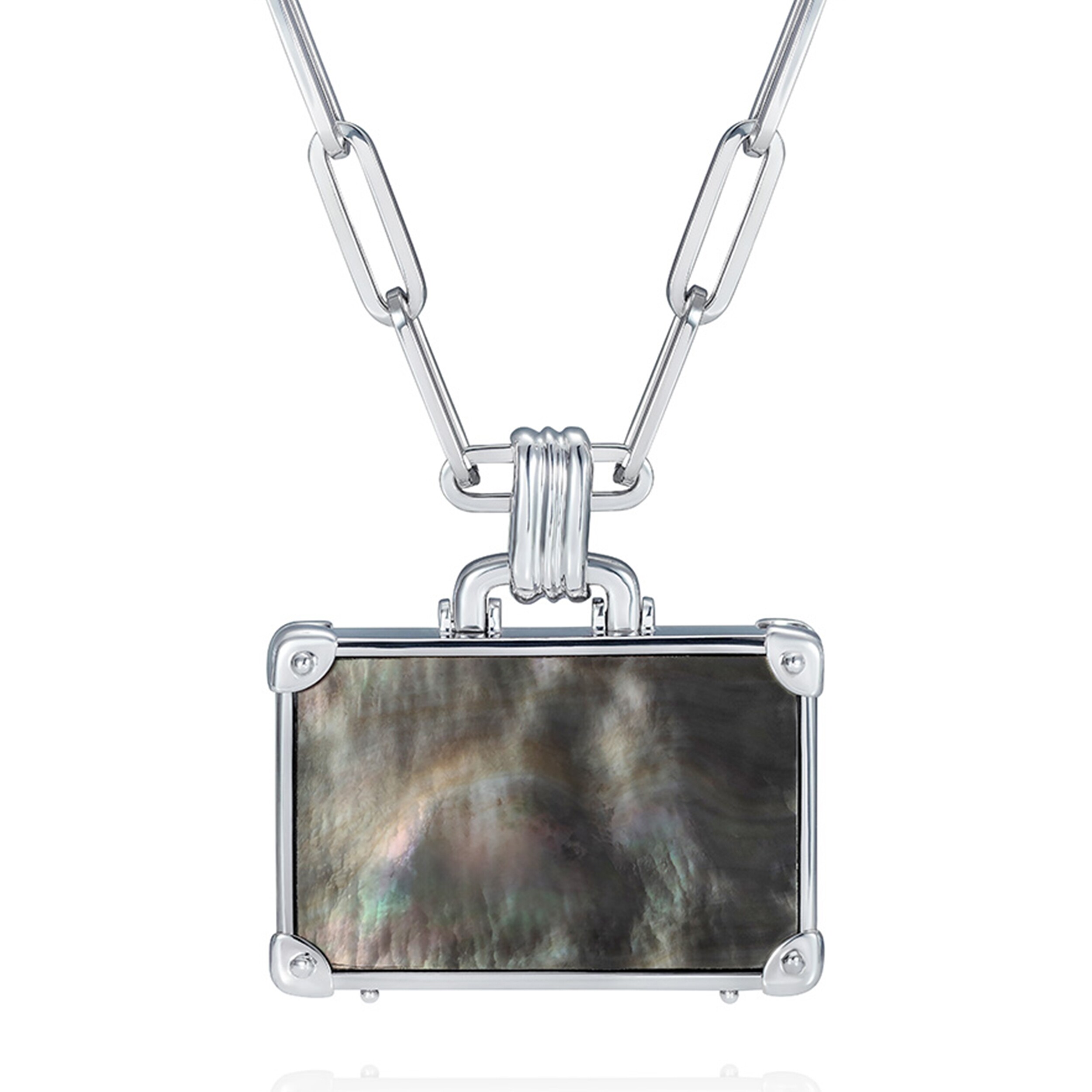 Collier NeverNot Travel « Powder Snow » Suitcase L en or blanc, nacre noire et blanche, œil de tigre et rhodium noir.