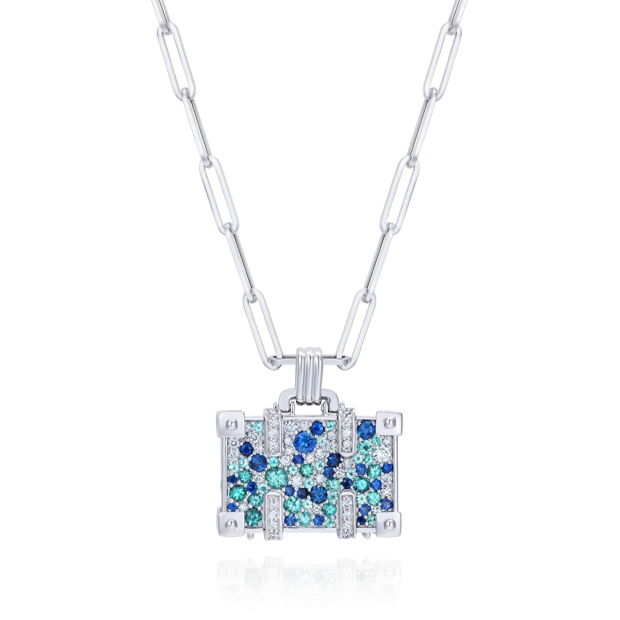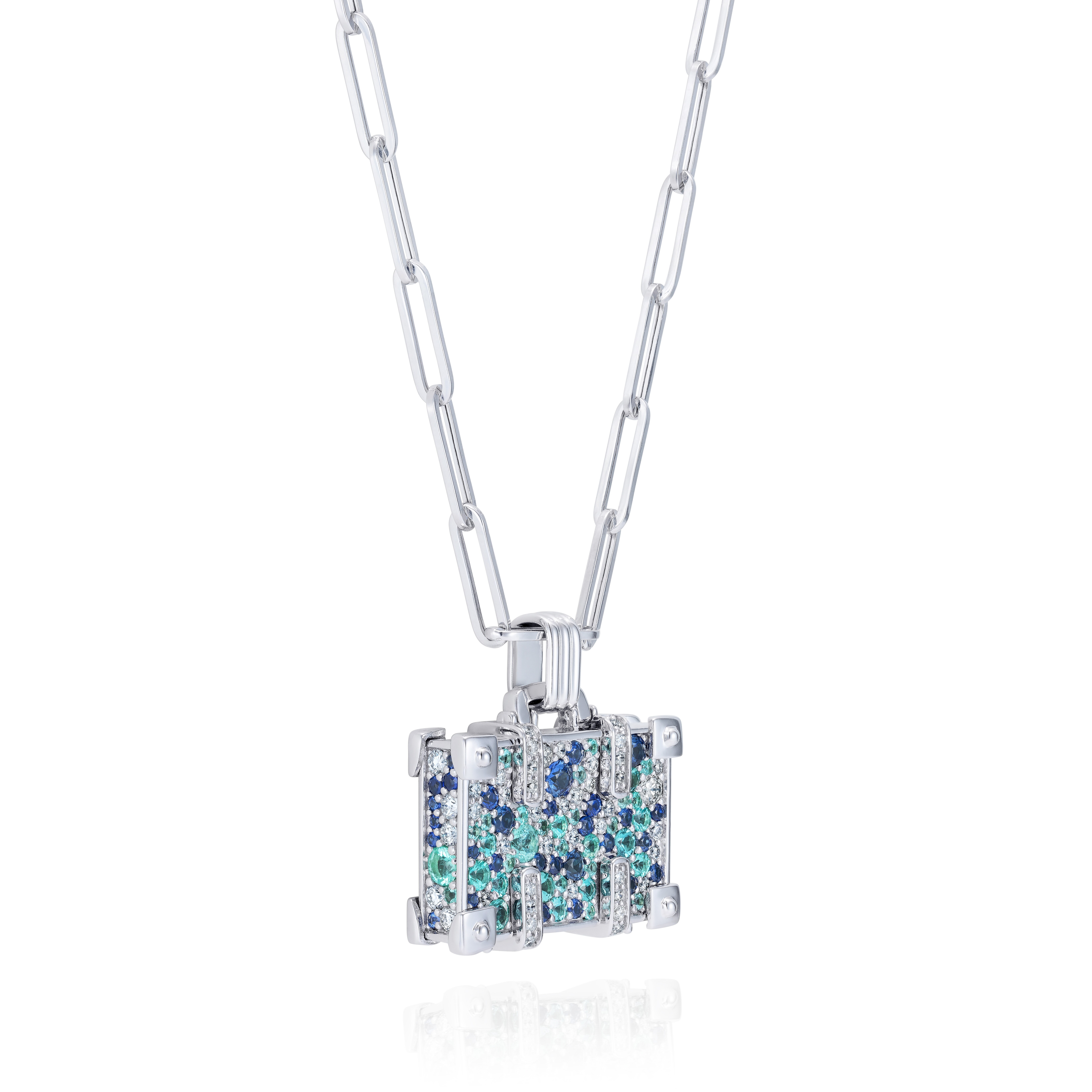 Collier NeverNot Travel Touch The Sky Suitcase en or blanc, tourmalines Paraiba, saphirs bleus et diamants.