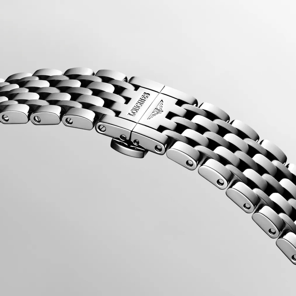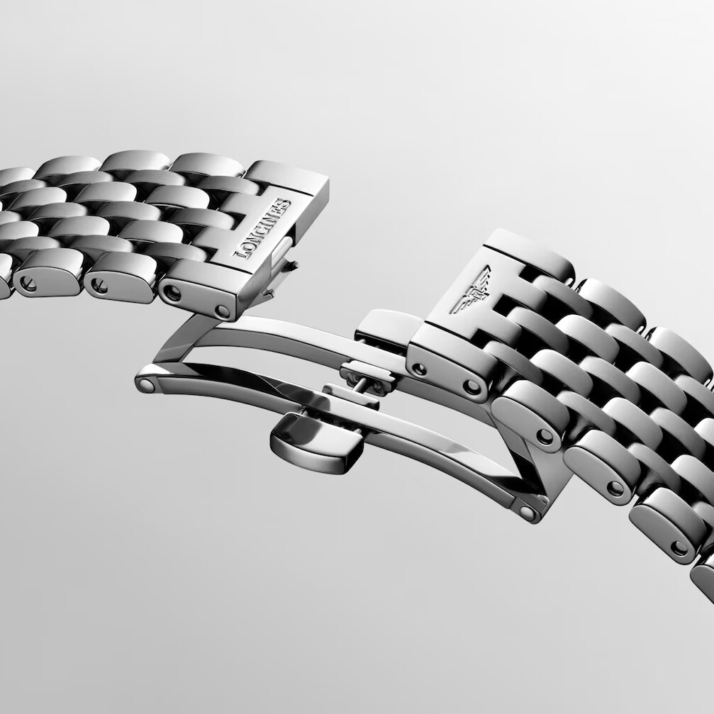 Le bracelet en acier inoxydable s’harmonise parfaitement avec le boîtier pour un ensemble à la fois durable et confortable. Il est équipé d’un fermoir déployant triple sécurité avec mécanisme d’ouverture par poussoirs, garantissant une tenue sûre et un ajustement optimal au poignet.