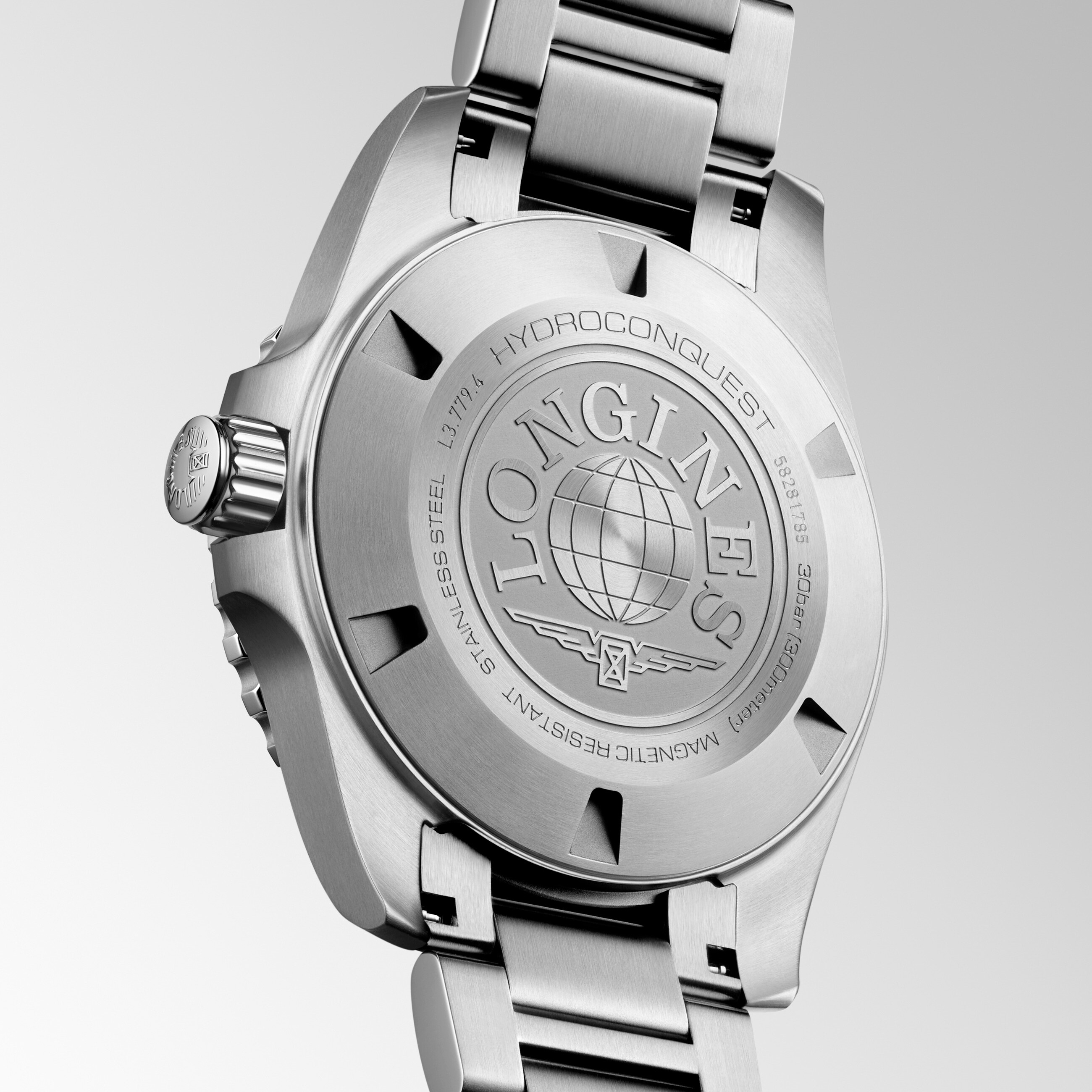 • Fond transparent vissé brossé ; mappe monde et logo Longines