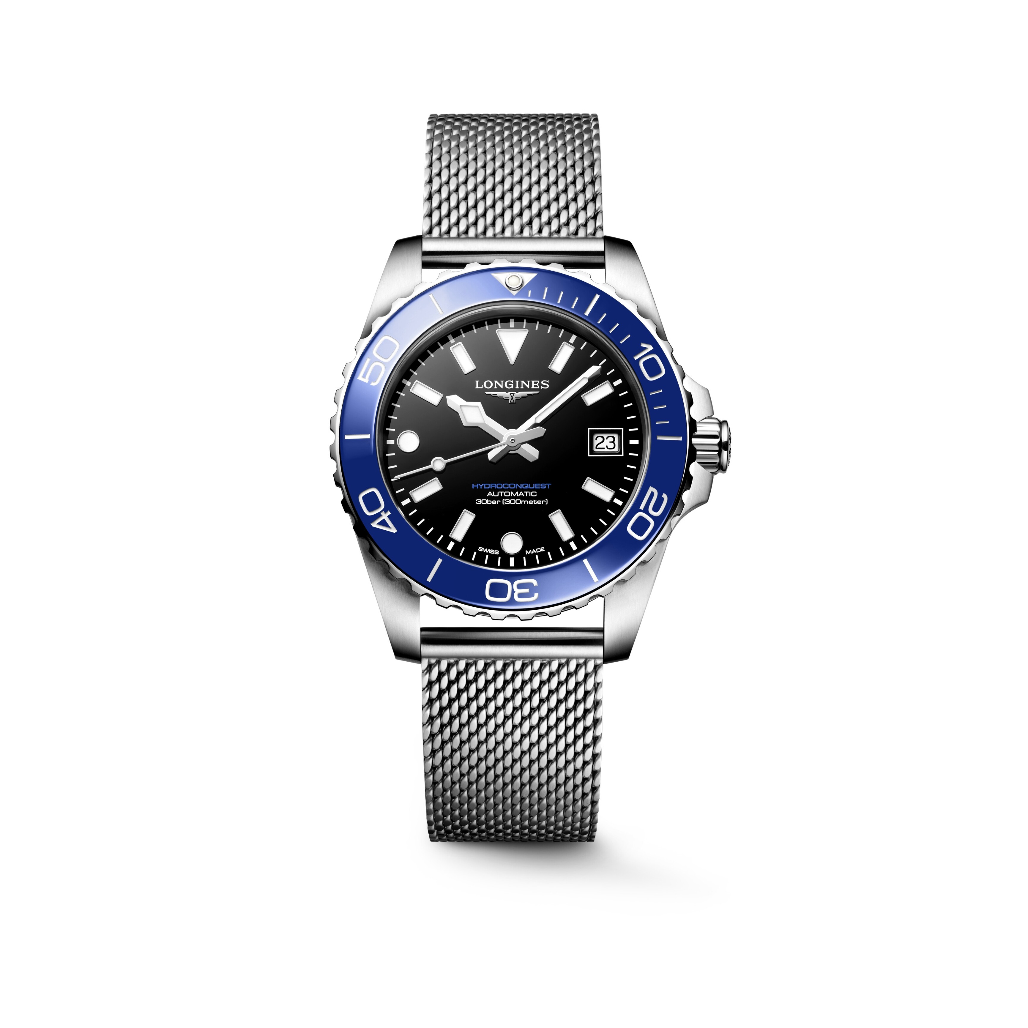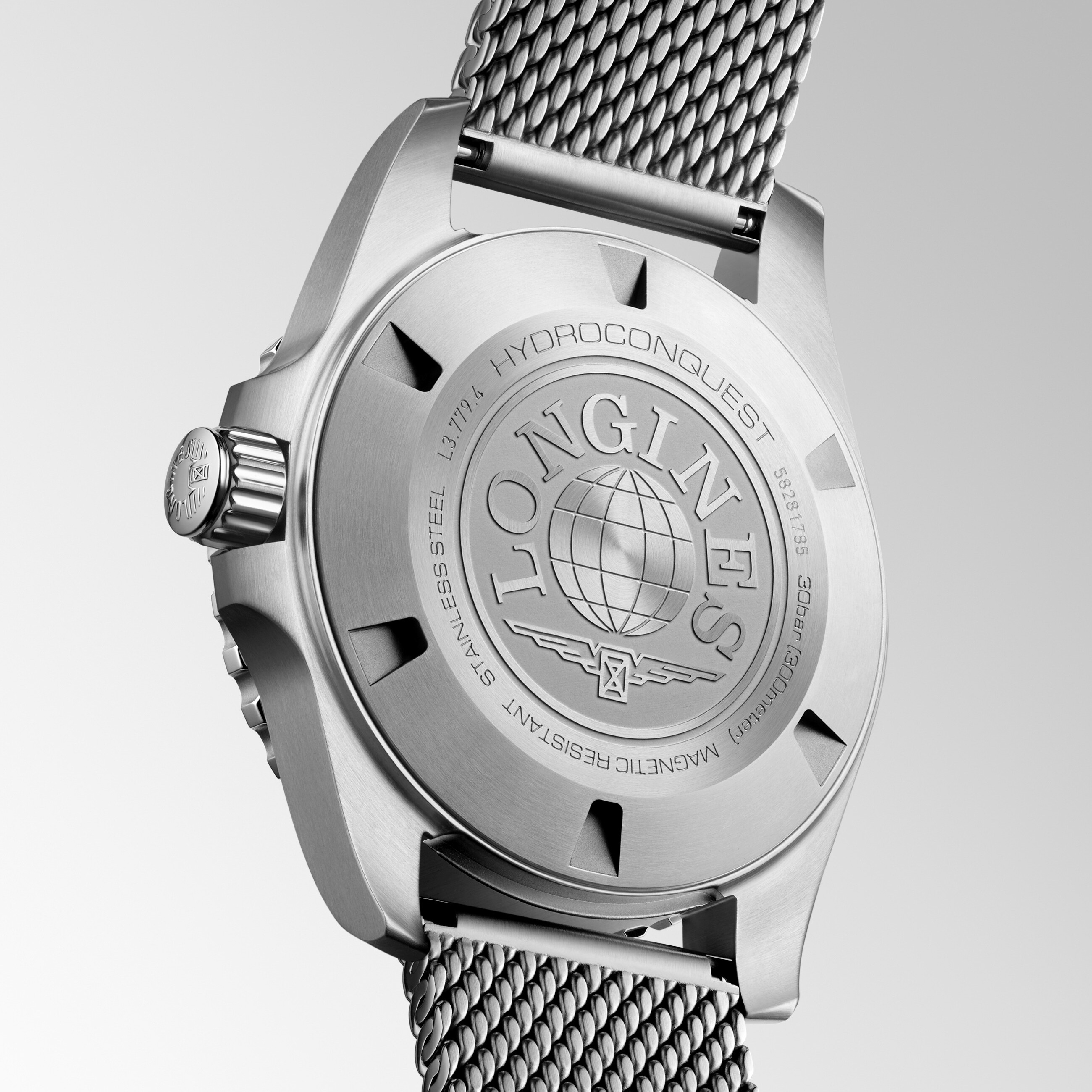 • Fond transparent vissé brossé ; mappe monde et logo Longines